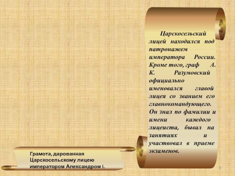 Слайд 8Царскосельский лицей находился под патронажем императора России. Кроме того, граф