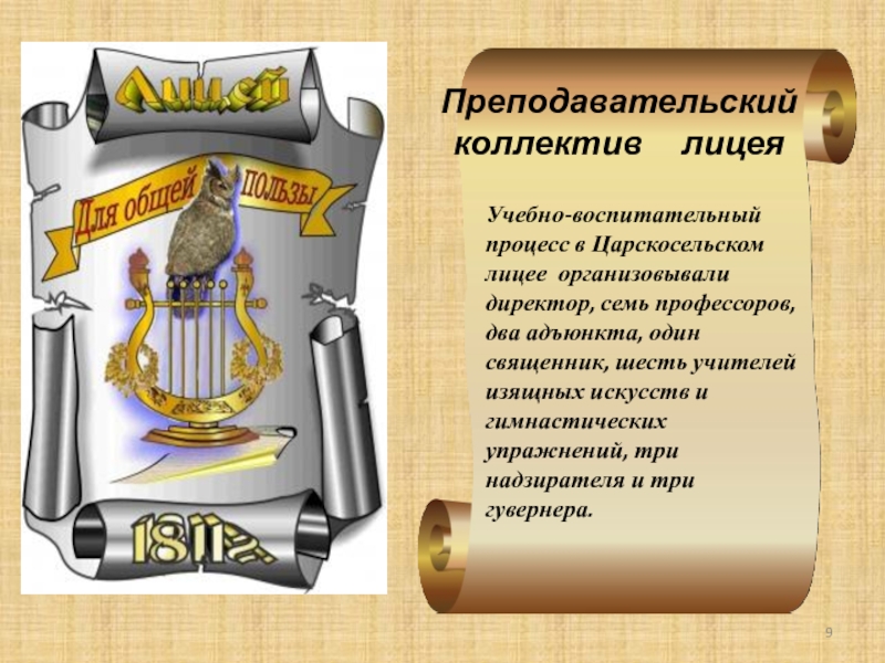 Царскосельском лицее организовывали директор, семь профессоров, два адъюнкта, один священник,