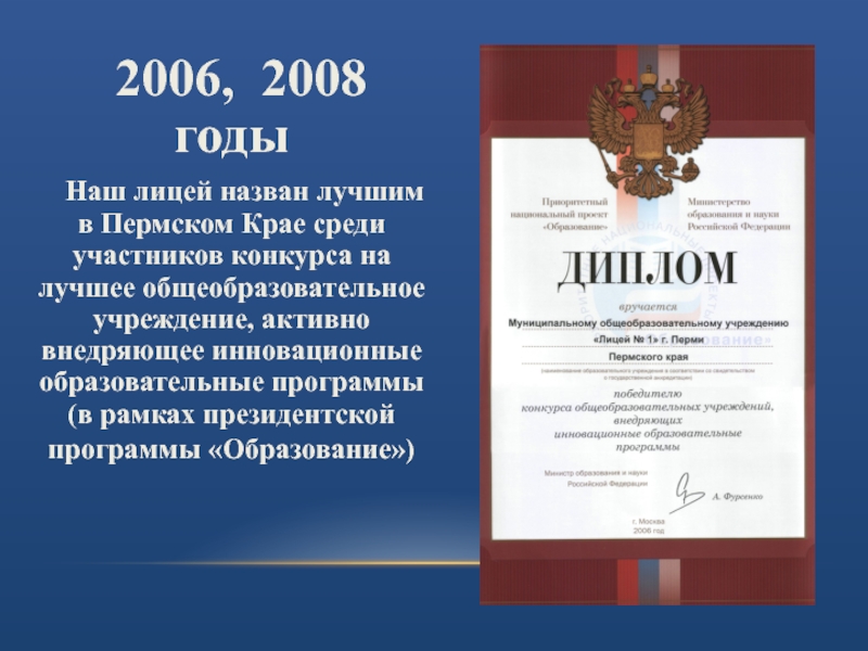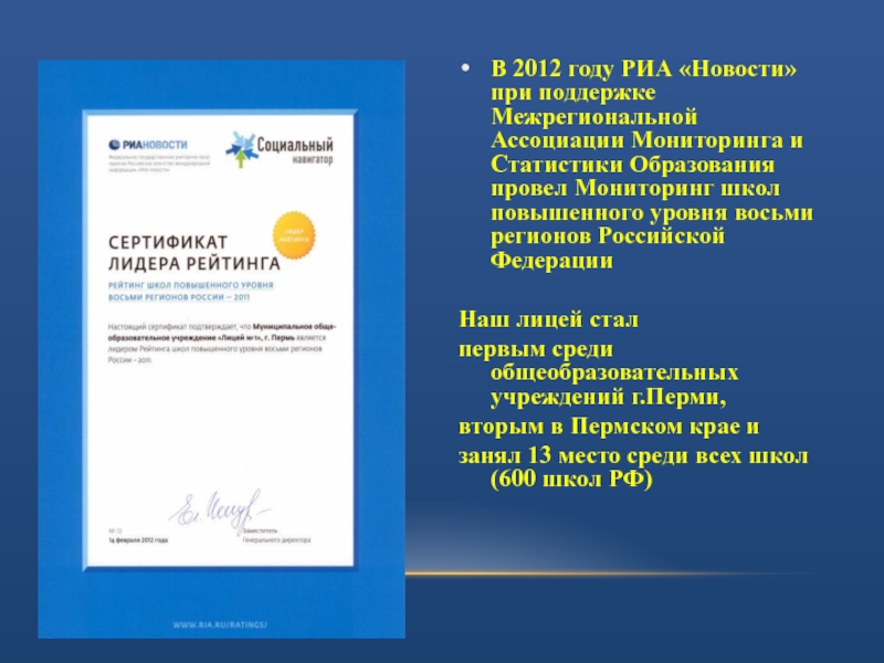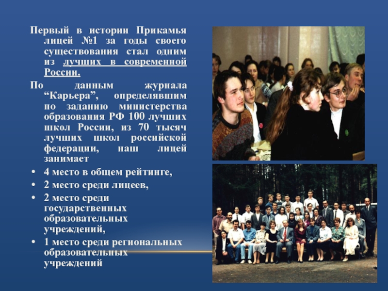 “Карьера”, определявшим по заданию министерства образования РФ 100 лучших школ России, из 70 тысяч лучших школ российской федерации, наш лицей занимает