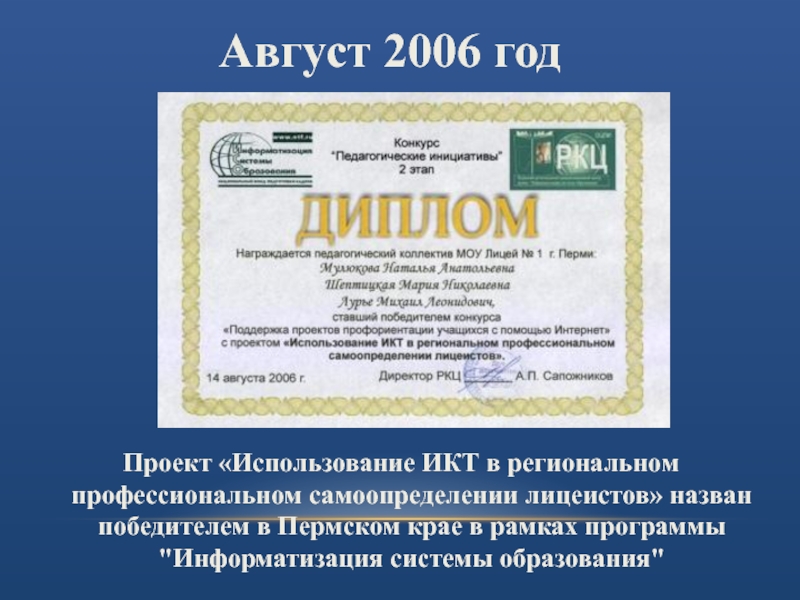 Слайд 15Проект «Использование ИКТ в региональном профессиональном самоопределении лицеистов» назван победителем