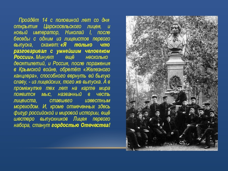 из лицеистов первого выпуска, скажет: «Я только что разговаривал с умнейшим человеком России». Минует ещё несколько десятилетий, и Россия, после поражения в Крымской войне, обретёт «Железного канцлера», способного вернуть ей былую славу, - из лицейских, того же выпуска. А в промежутке тех лет на карте мира появится мыс, названный в честь лицеиста, ставшего известным мореходом. И, кроме отмеченных здесь фигур российской и мировой истории, ещё шестеро выпускников Лицея первого набора, станут гордостью Отечества!