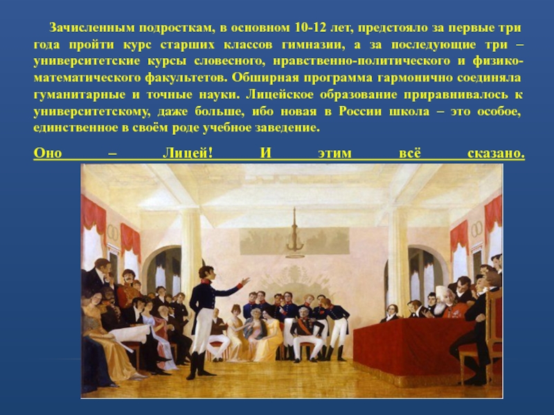 последующие три – университетские курсы словесного, нравственно-политического и физико-математического факультетов. Обширная программа гармонично соединяла гуманитарные и точные науки. Лицейское образование приравнивалось к университетскому, даже больше, ибо новая в России школа – это особое, единственное в своём роде учебное заведение.