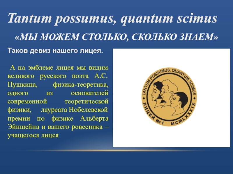 на эмблеме лицея мы видим великого русского поэта А.С.Пушкина, физика-теоретика,