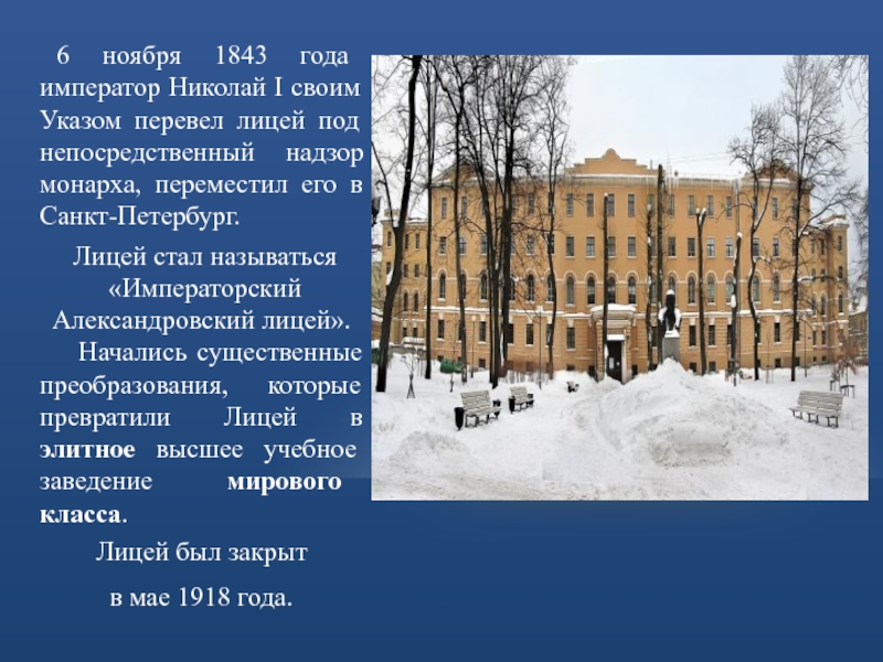 перевел лицей под непосредственный надзор монарха, переместил его в Санкт-Петербург.