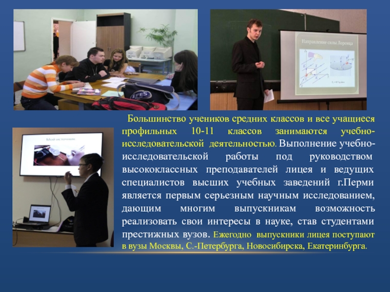 преподавателей лицея и ведущих специалистов высших учебных заведений г.Перми является первым серьезным научным исследованием, дающим многим выпускникам возможность реализовать свои интересы в науке, став студентами престижных вузов. Ежегодно выпускники лицея поступают в вузы Москвы, С.-Петербурга, Новосибирска, Екатеринбурга.