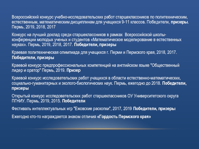 Открытый конкурс исследовательских работ старшеклассников ОУ Университетского округа ПГНИУ. Пермь, 2019, 2015. Победители