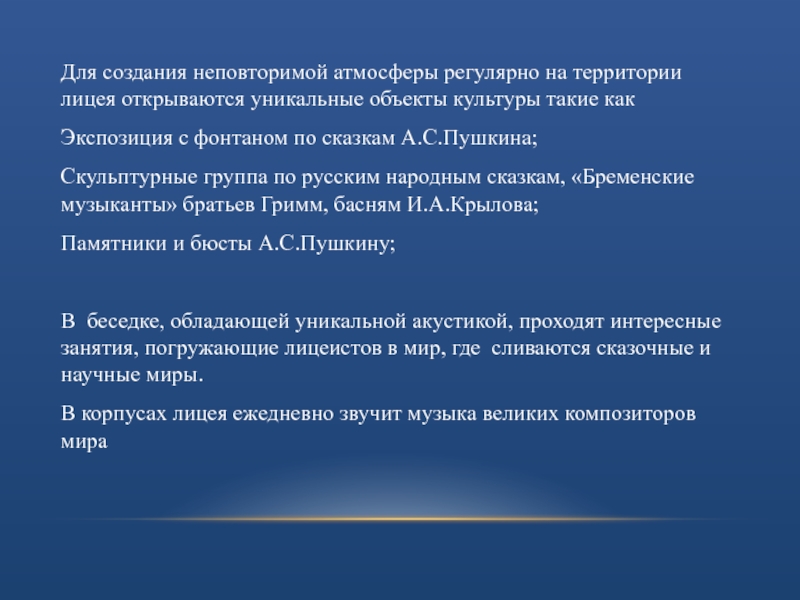 Слайд 33Для создания неповторимой атмосферы регулярно на территории лицея открываются уникальные