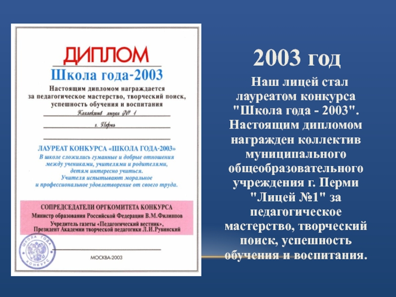 2003". Настоящим дипломом награжден коллектив муниципального общеобразовательного учреждения г. Перми