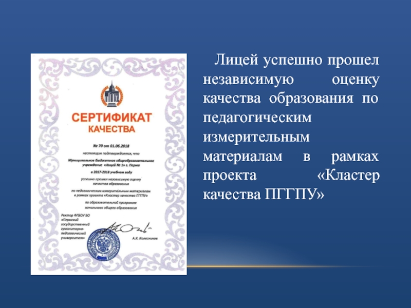 Слайд 18 Лицей успешно прошел независимую оценку качества образования по