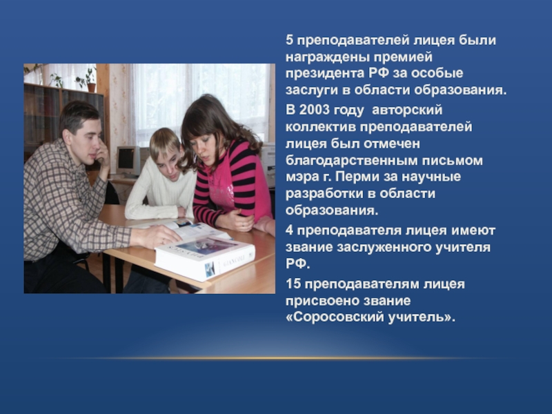 4 преподавателя лицея имеют звание заслуженного учителя РФ.