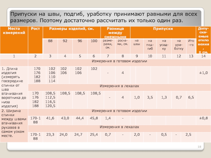 Слайд 18Припуски на швы, подгиб, уработку принимают равными для всех размеров.