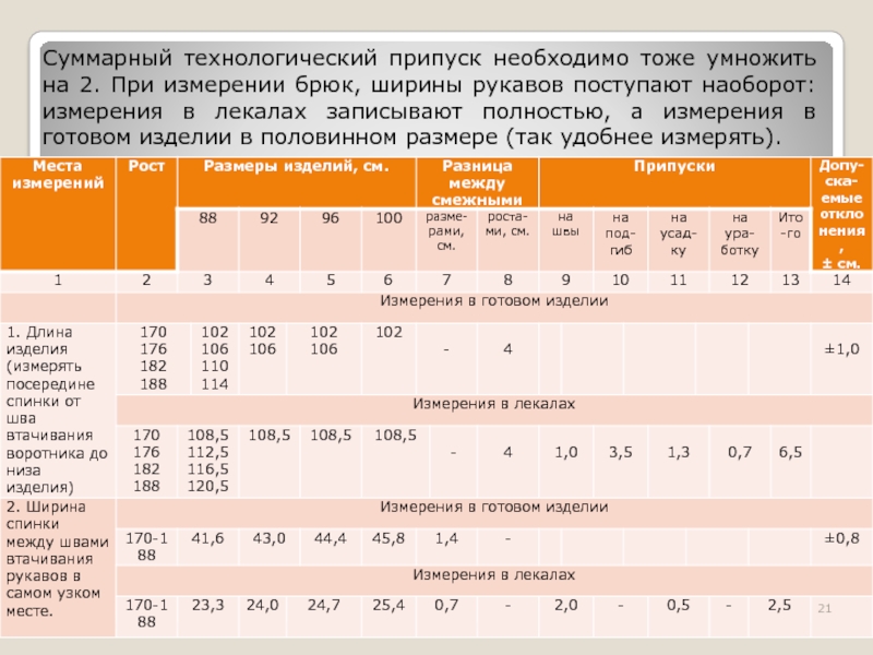 брюк, ширины рукавов поступают наоборот: измерения в лекалах записывают полностью,