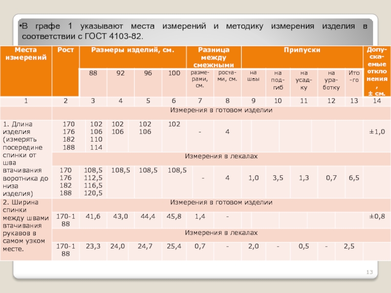 Слайд 13В графе 1 указывают места измерений и методику измерения изделия