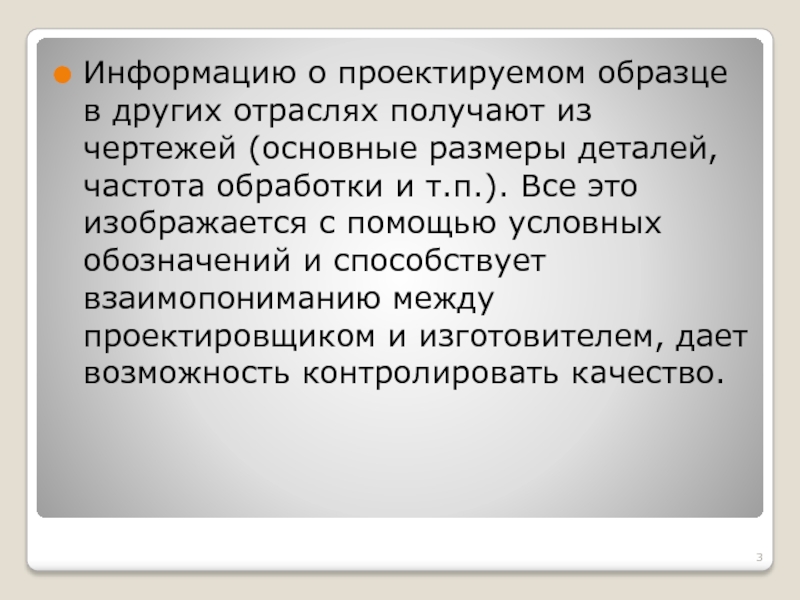 Слайд 3Информацию о проектируемом образце в других отраслях получают из чертежей