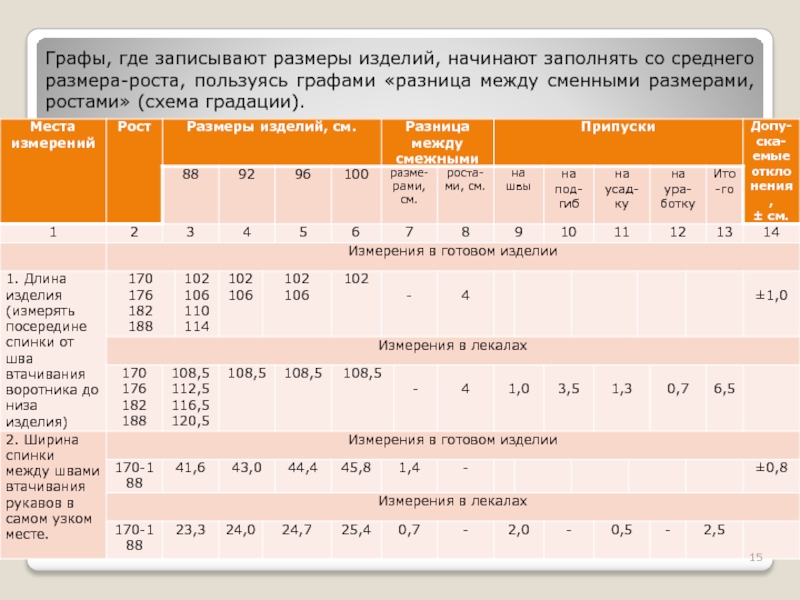 Слайд 15Графы, где записывают размеры изделий, начинают заполнять со среднего размера-роста,