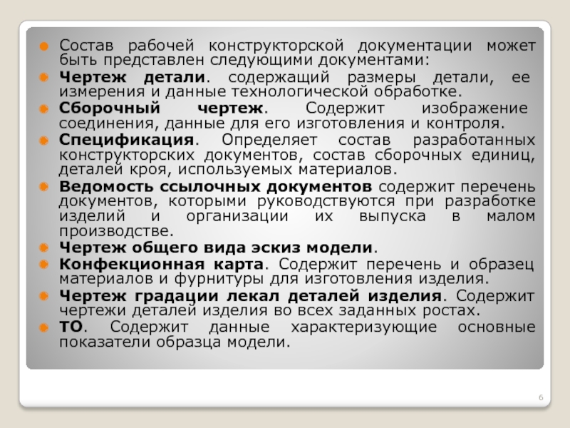 Слайд 6Состав рабочей конструкторской документации может быть представлен следующими документами:
