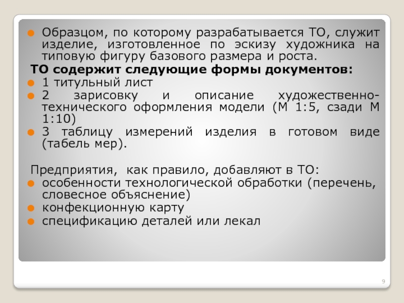 Слайд 9Образцом, по которому разрабатывается ТО, служит изделие, изготовленное по эскизу