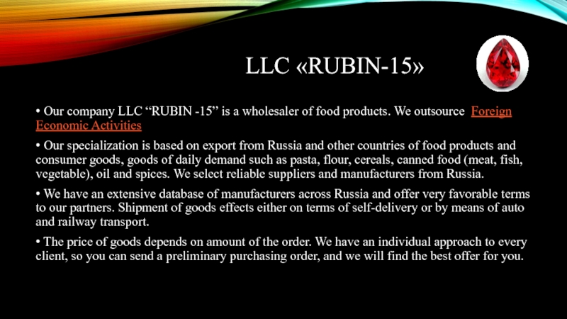 competent specialists with great experience.• Our specialization is based on export from Russia and other countries of food products and consumer goods, goods of daily demand such as pasta, flour, cereals, canned food (meat, fish, vegetable), oil and spices. We select reliable suppliers and manufacturers from Russia.