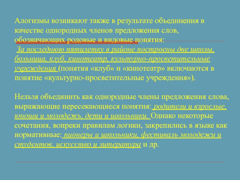 Слайд 32Алогизмы возникают также в результате объединения в качестве однородных членов