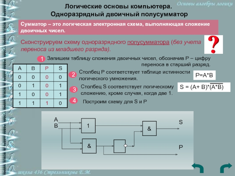 Запишем таблицу сложения двоичных чисел, обозначив Р – цифру переноса в старший разряд.