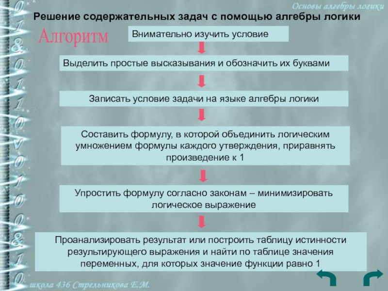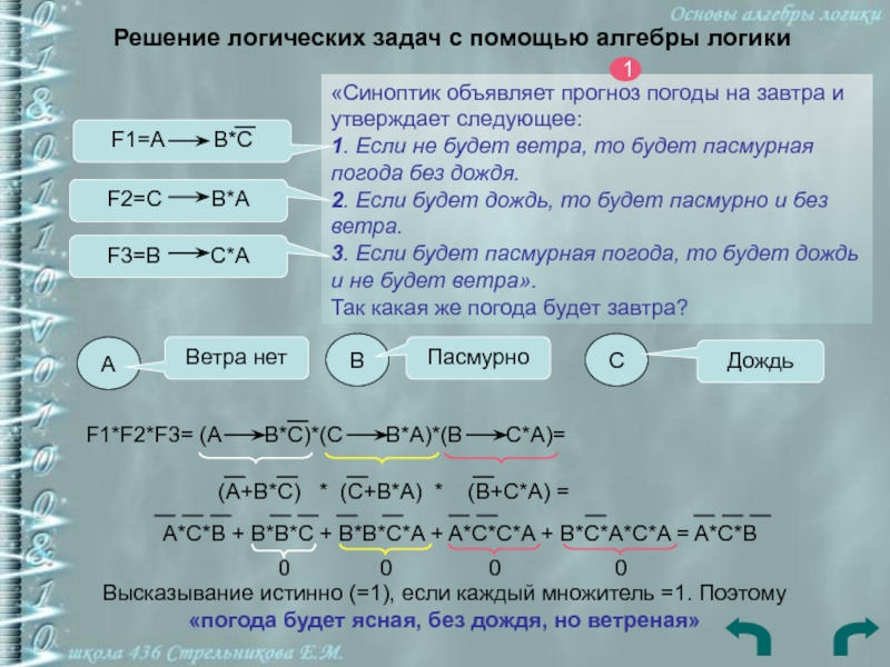 Составить формулу, в которой объединить логическим умножением формулы каждого утверждения, приравнять произведение к 1