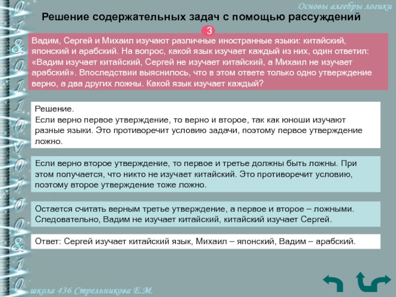 Ответ: Сергей изучает китайский язык, Михаил – японский, Вадим – арабский.