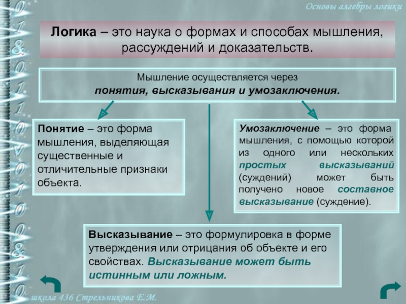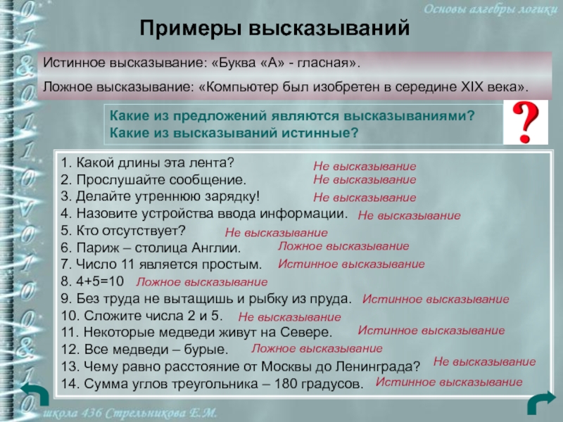 Высказывание – это формулировка в форме утверждения или отрицания об объекте и его свойствах. Высказывание может быть истинным или ложным.