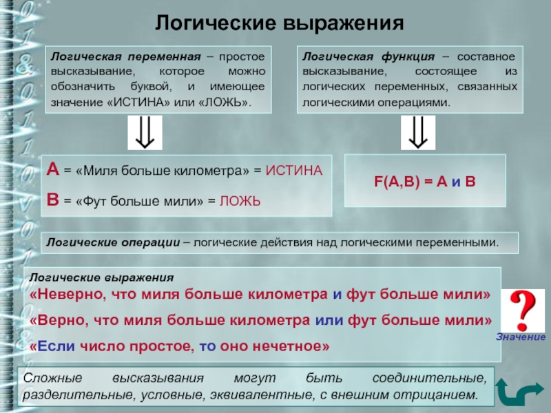 Сложные высказывания могут быть соединительные, разделительные, условные, эквивалентные, с внешним отрицанием.