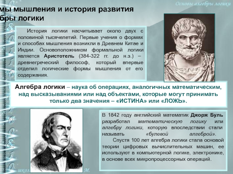 В 1842 году английский математик Джорж Буль разработал математическую логику или алгебру логики, которую впоследствии стали называть «булевой алгеброй».