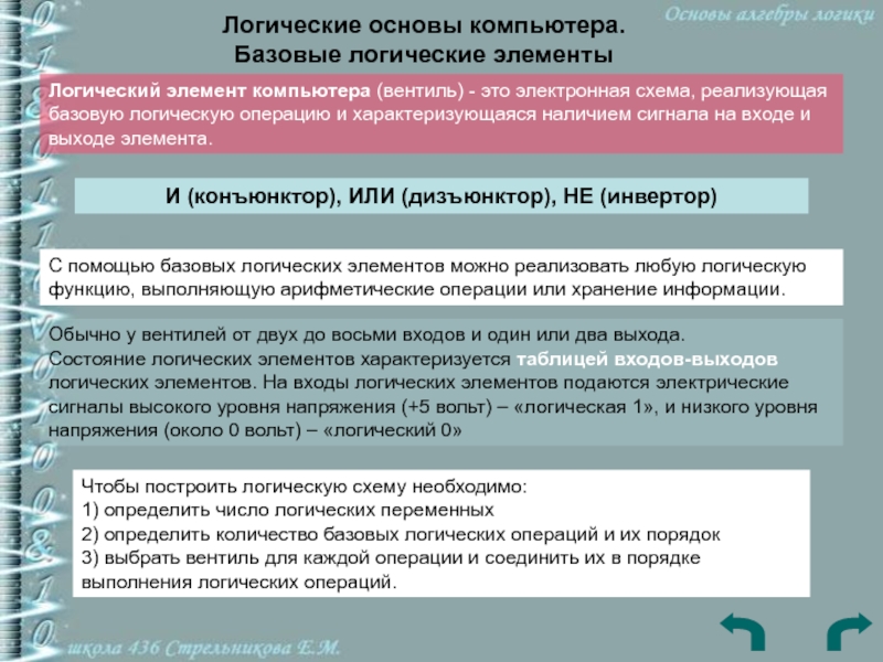 С помощью базовых логических элементов можно реализовать любую логическую функцию, выполняющую арифметические операции или хранение информации.