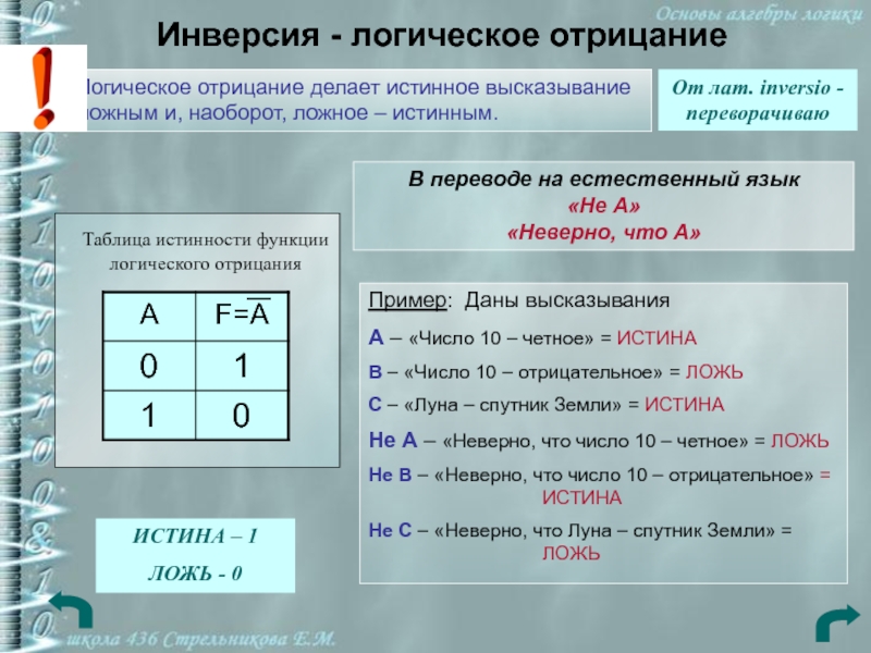 Не В – «Неверно, что число 10 – отрицательное» = ИСТИНА