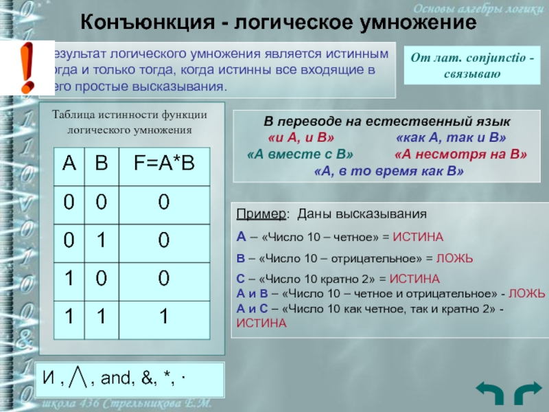Высказывание истинно (=1), если каждый множитель =1. Поэтому
