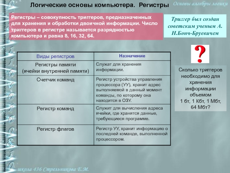 Регистры – совокупность триггеров, предназначенных для хранения и обработки двоичной информации. Число триггеров в регистре называется разрядностью компьютера и равна 8, 16, 32, 64.