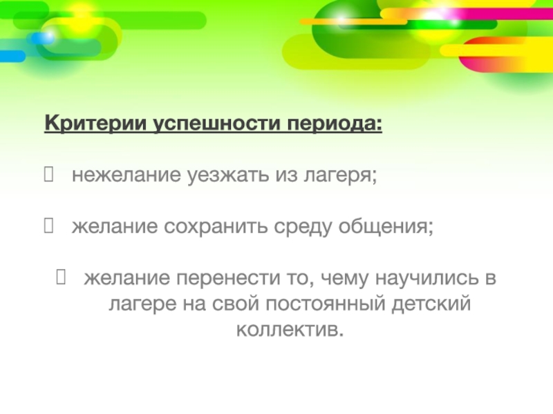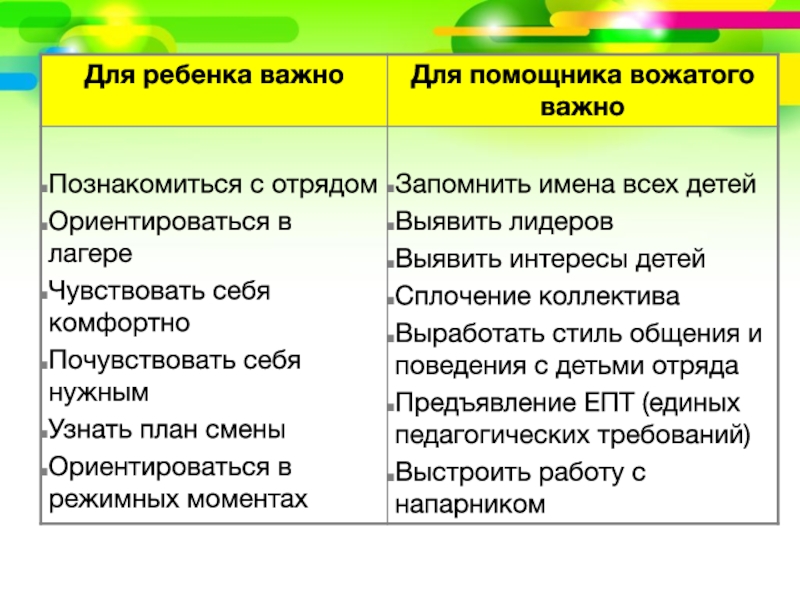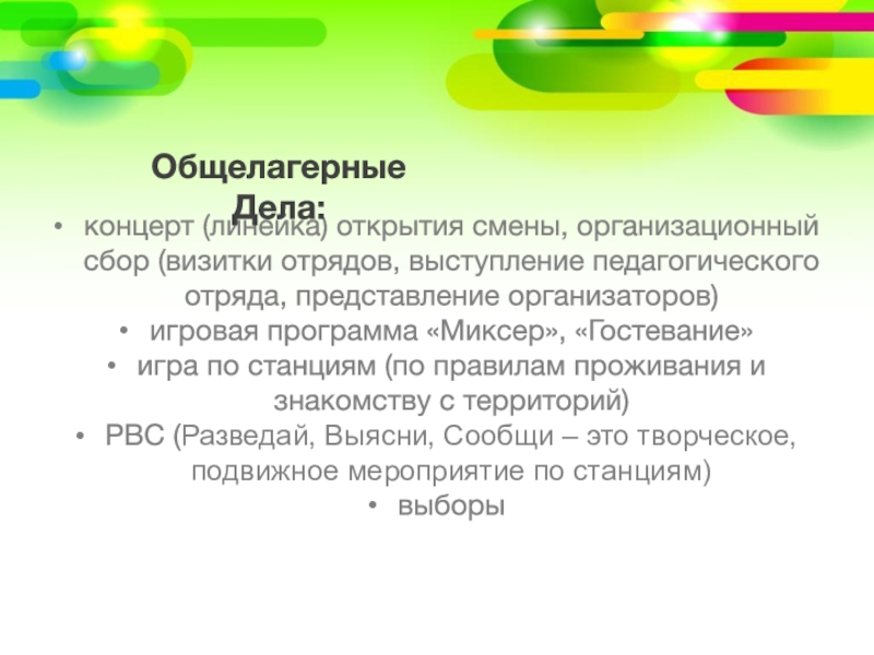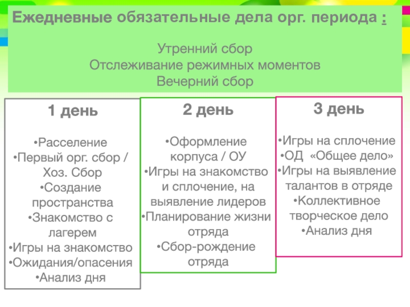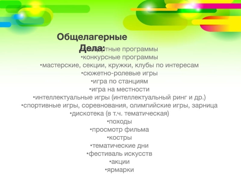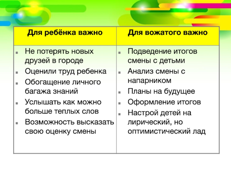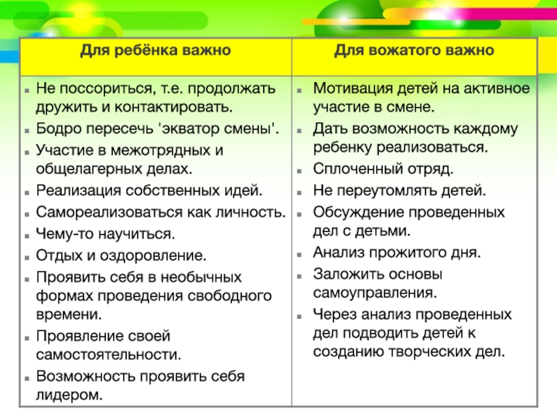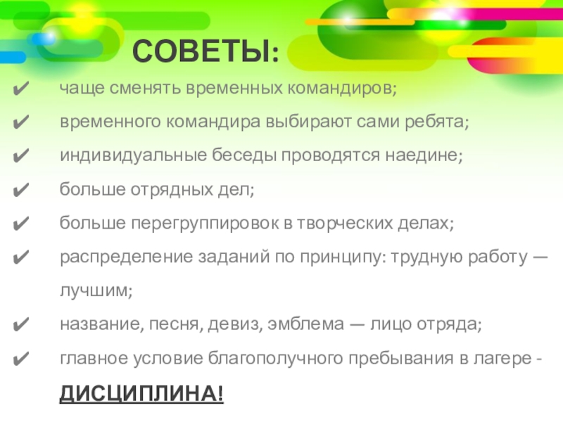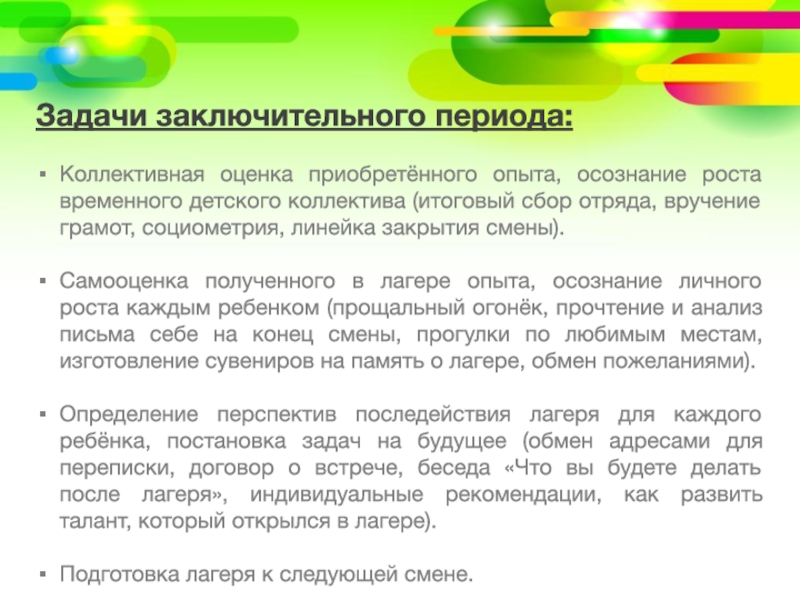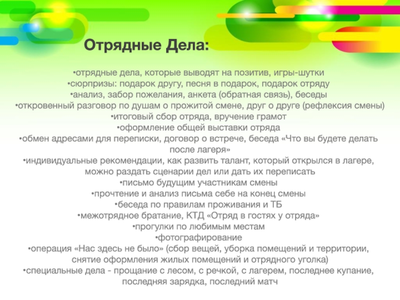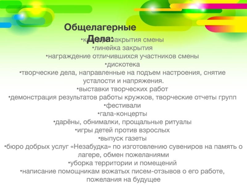 индивидуальные рекомендации, как развить талант, который открылся в лагере, можно раздать сценарии дел или дать их переписать