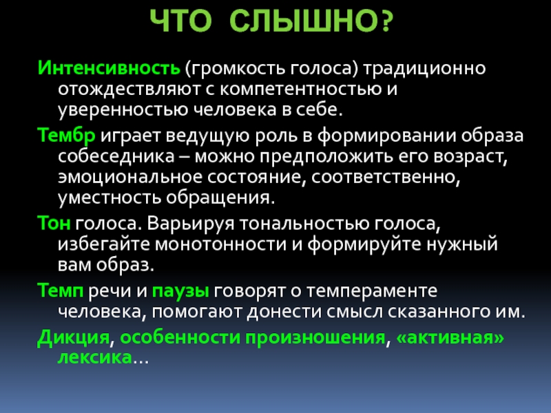 Интенсивность (громкость голоса) традиционно отождествляют с компетентностью и уверенностью