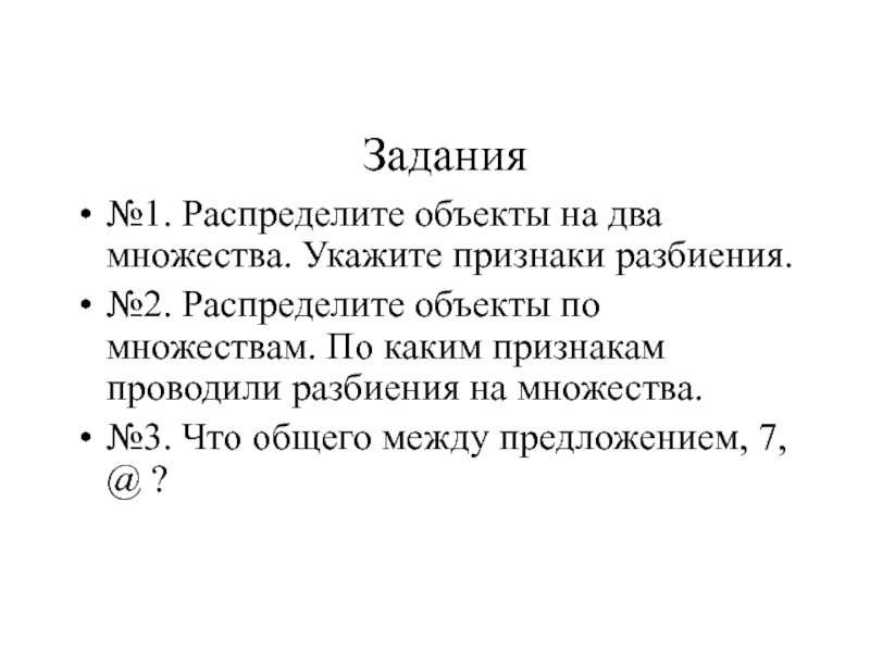 Задания№1. Распределите объекты на два множества. Укажите признаки разбиения.№2. Распределите объекты по множествам. По каким признакам