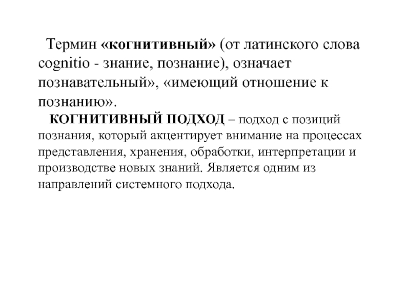 Термин «когнитивный» (от латинского слова cognitio - знание, познание), означает познавательный», «имеющий отношение к познанию». КОГНИТИВНЫЙ ПОДХОД – подход с позиций познания, который акцентирует внимание на процессах представления, хранения, обработки, интерпретации