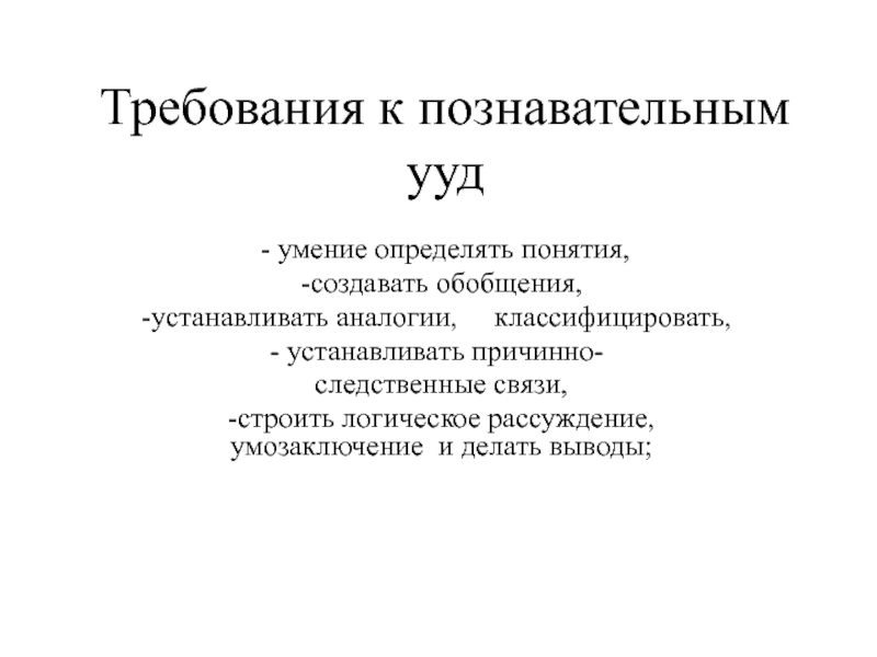Требования к познавательным ууд - умение определять понятия, -создавать обобщения,устанавливать аналогии,   классифицировать, устанавливать причинно-следственные связи,
