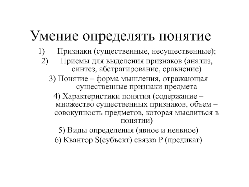 Умение определять понятиеПризнаки (существенные, несущественные);Приемы для выделения признаков (анализ, синтез, абстрагирование, сравнение)3) Понятие – форма мышления, отражающая