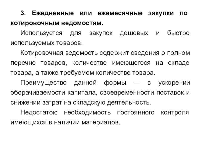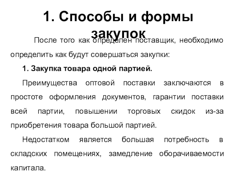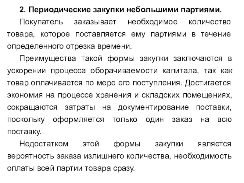 Недостатком этой формы закупки является вероятность заказа излишнего количества, необходимость оплаты всей партии товара сразу.