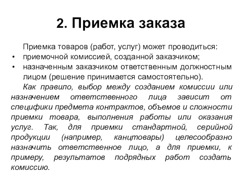 выбор между созданием комиссии или назначением ответственного лица зависит от специфики предмета контрактов, объемов и сложности приемки товара, выполнения работы или оказания услуг. Так, для приемки стандартной, серийной продукции (например, канцтовары) целесообразно назначить ответственное лицо, а для приемки, к примеру, результатов подрядных работ создать комиссию.