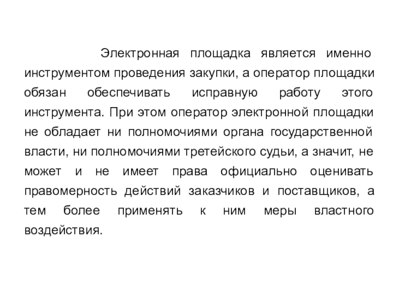 этом оператор электронной площадки не обладает ни полномочиями органа государственной власти, ни полномочиями третейского судьи, а значит, не может и не имеет права официально оценивать правомерность действий заказчиков и поставщиков, а тем более применять к ним меры властного воздействия.