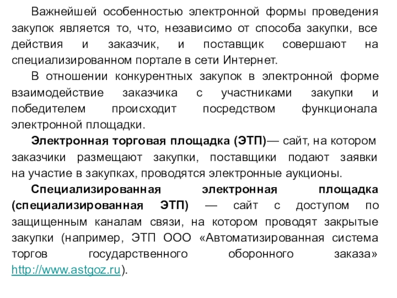 Специализированная электронная площадка (специализированная ЭТП) — сайт с доступом по защищенным каналам связи, на котором проводят закрытые закупки (например, ЭТП ООО «Автоматизированная система торгов государственного оборонного заказа» http://www.astgoz.ru).