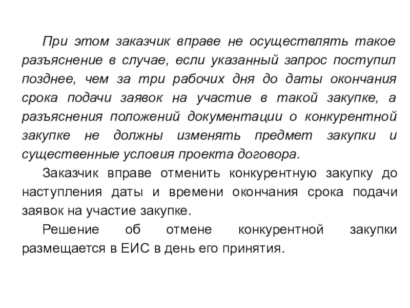 до даты окончания срока подачи заявок на участие в такой закупке, а разъяснения положений документации о конкурентной закупке не должны изменять предмет закупки и существенные условия проекта договора.