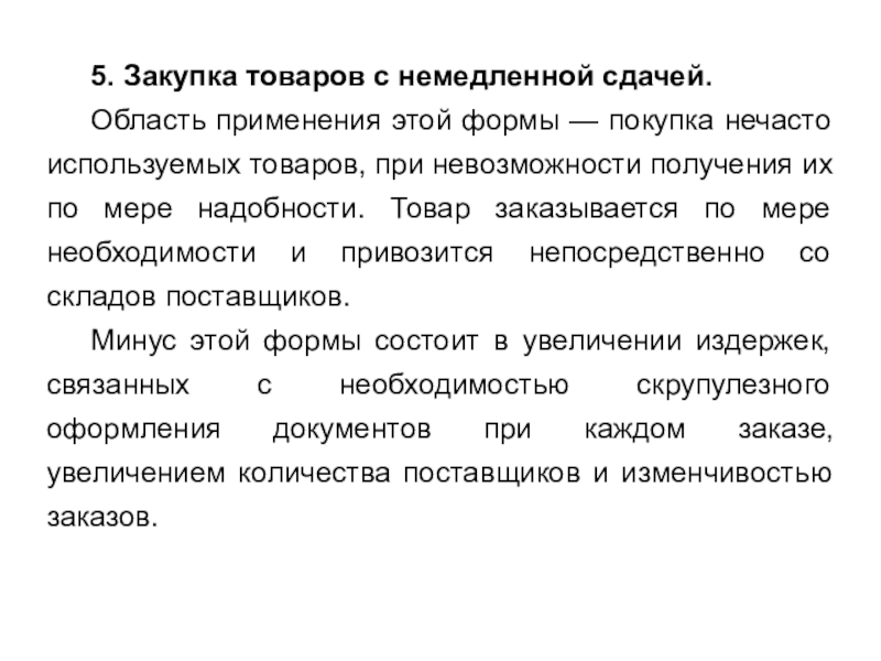 Минус этой формы состоит в увеличении издержек, связанных с необходимостью скрупулезного оформления документов при каждом заказе, увеличением количества поставщиков и изменчивостью заказов.