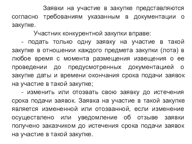 - подать только одну заявку на участие в такой закупке в отношении каждого предмета закупки (лота) в любое время с момента размещения извещения о ее проведении до предусмотренных документацией о закупке даты и времени окончания срока подачи заявок на участие в такой закупке;