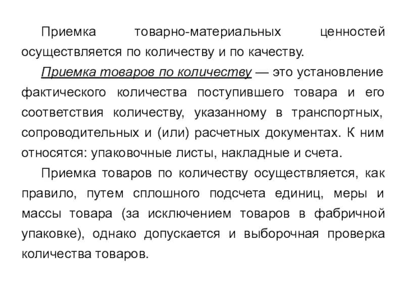 Слайд 17Приемка товарно-материальных ценностей осуществляется по количеству и по качеству.