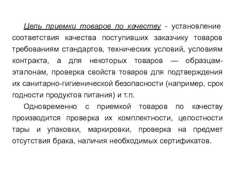 Слайд 18 Цель приемки товаров по качеству - установление соответствия качества поступивших