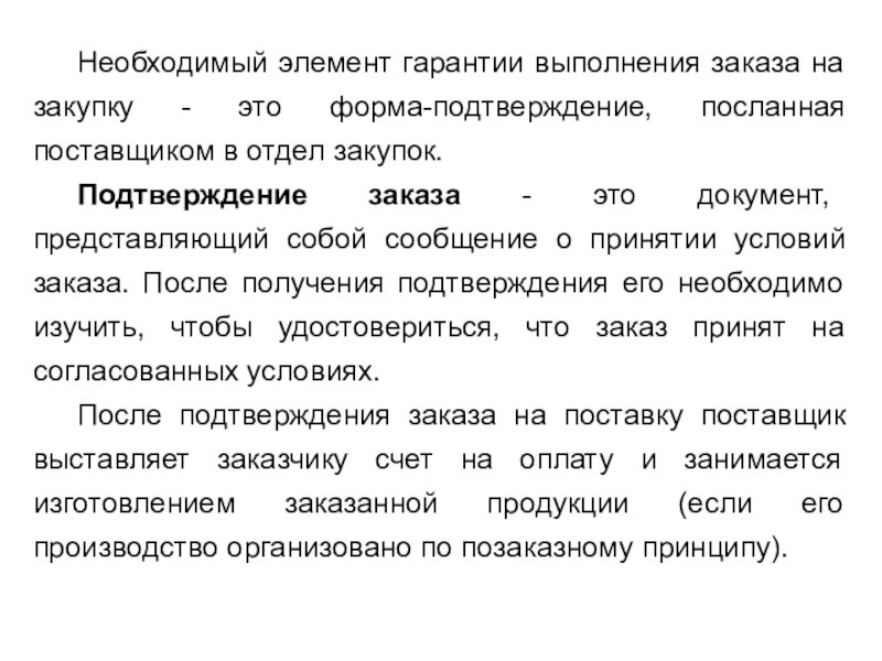 Слайд 12 Необходимый элемент гарантии выполнения заказа на закупку - это форма-подтверждение,