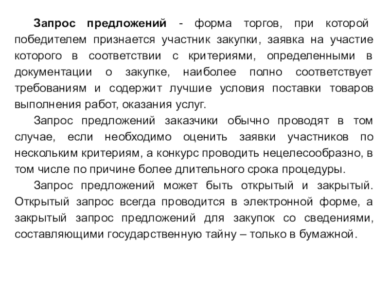- запрос предложений (запрос предложений в электронной форме, закрытый запрос предложений).